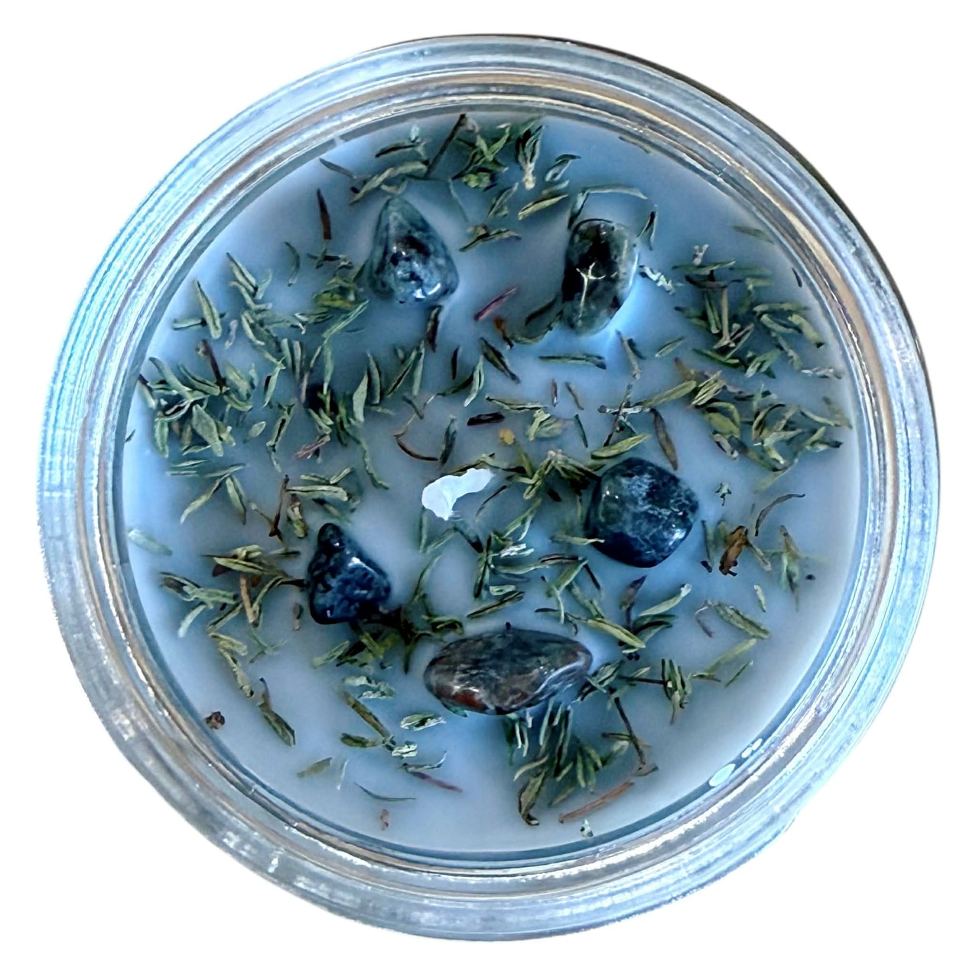 Black salt, blue sage, and clove with quartz stones and a matching thyme herbal blend.